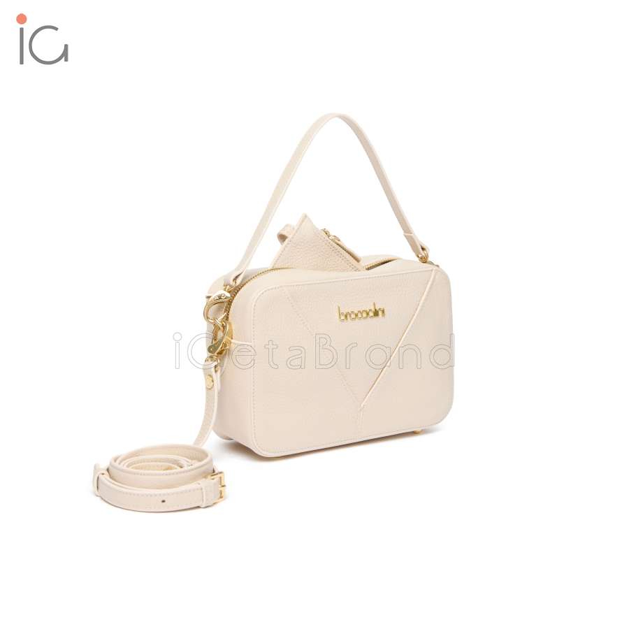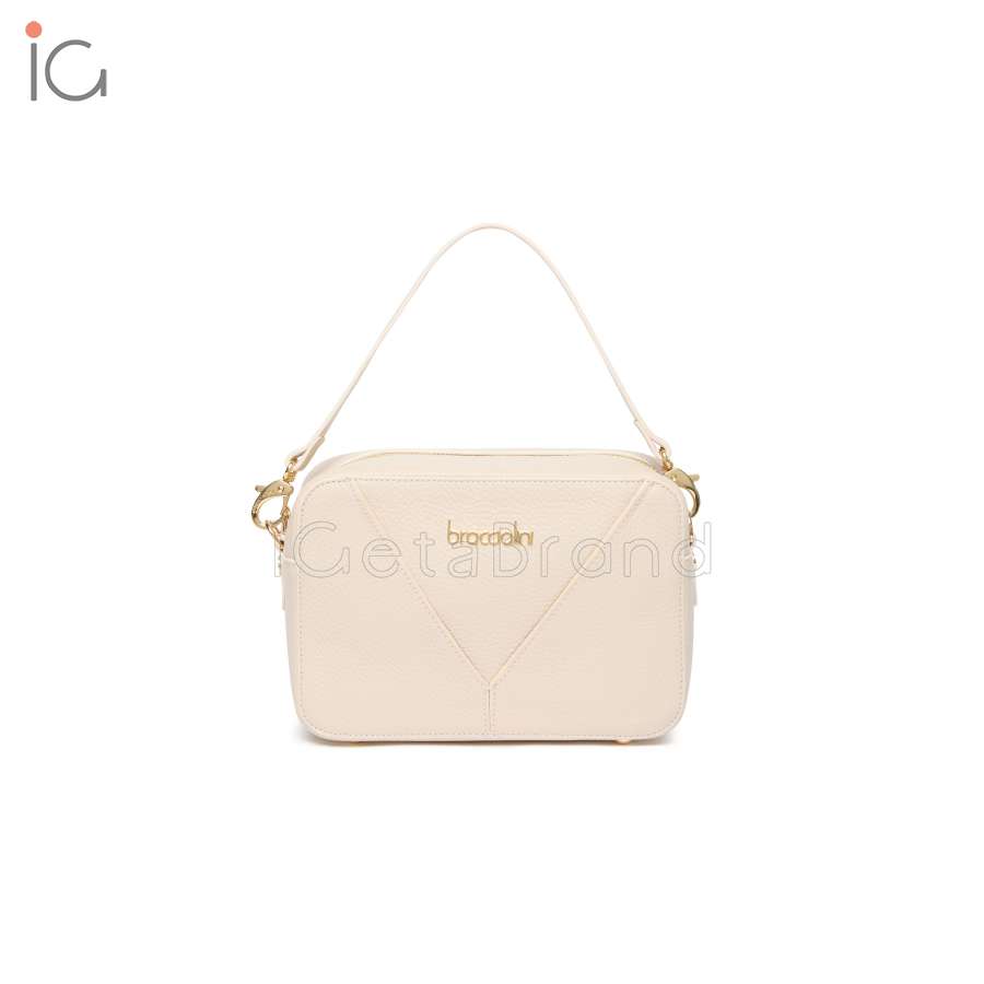 Collection 2025 FW.  Manufacturer: Braccialini.  Line: Sara.  Functionality: handbag.  Material: genuine leather.  leather.  Color: beige.  Warranty 2 years.  Shoulder strap adjustable.  Handle: double with removable and adjustable cross-body strap.  Closure: Zip.  Dimensions: 22x15x7.5 cm.  Height of handle: 12 cm.  Weight: 0.48 kg.